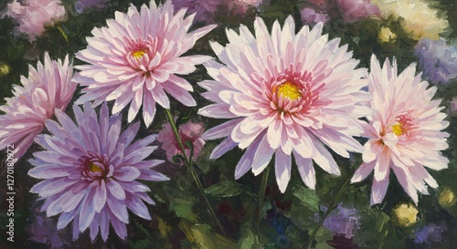 A beautiful oil painting of delicate pink and lavender chrysanthemums in full bloom, with soft brushstrokes creating a serene floral scene set against lush green and muted background tones.