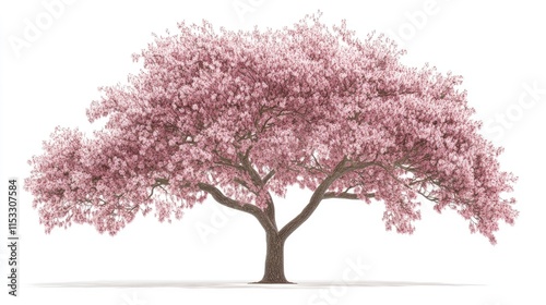 A beautiful sakura tree in full bloom, its delicate pink flowers set against a pristine white background, symbolizing spring and renewal.