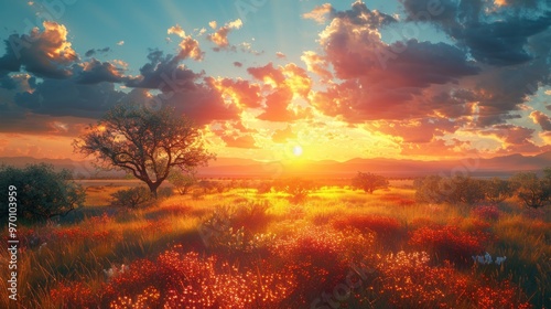 A beautiful scene on a meadow with bright flowers and trees against a sunset backdrop.