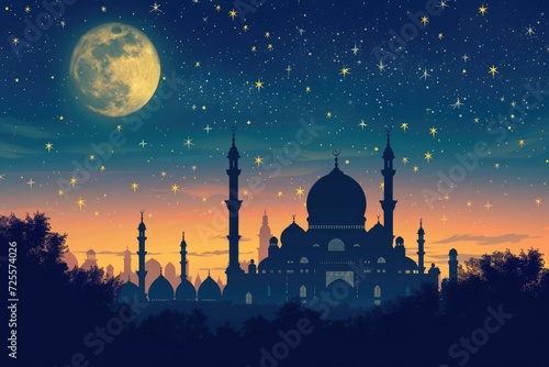 A beautiful silhouette of a mosque and Mesmerizing night view of a mosque under starry sky and bright moon. Perfect for Ramadan, Eid, or Islamic religious themed designs.