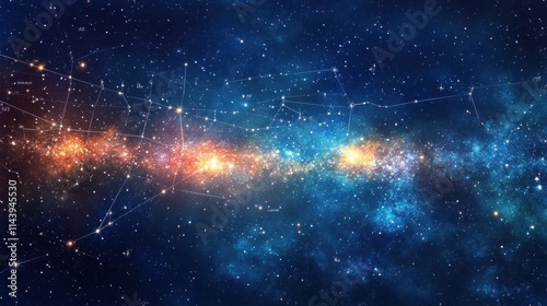 A beautiful starfield featuring constellations, with labels highlighting mythological stories