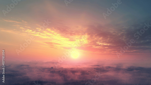 A beautiful sunset breaking through a foggy sky, with soft pastel hues filling the horizon and the landscape bathed in mist.