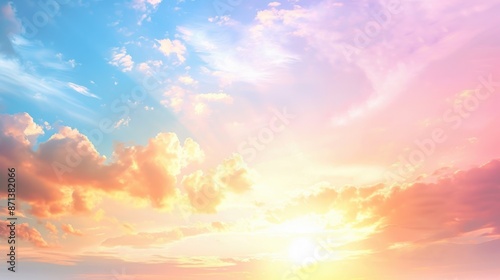 A beautiful sunset with pastel-colored clouds and a radiant sun, creating a serene atmosphere.