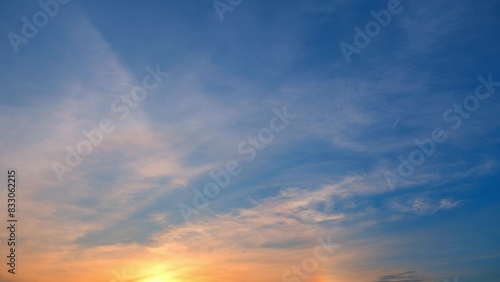A beautiful sunset with the sun partially visible near the horizon. The sky transitions from warm oranges and yellows near the sun to cooler blues higher up. Sunset sky background.