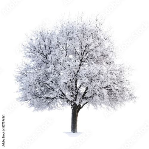 A beautiful tree covered in snow, standing alone on the frozen ground, isolated against white background PNG