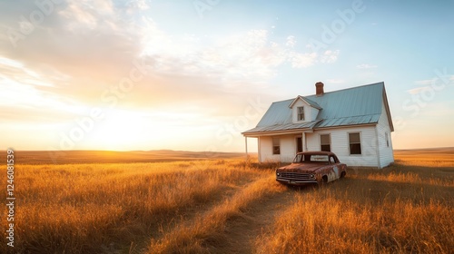 A beautiful view of a country home at dusk, featuring a classic car parked on a path surrounded by vibrant golden fields, evoking feelings of nostalgia.