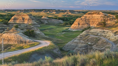 A beautiful view of the Badlands with rugged hills and a winding road at sunset.