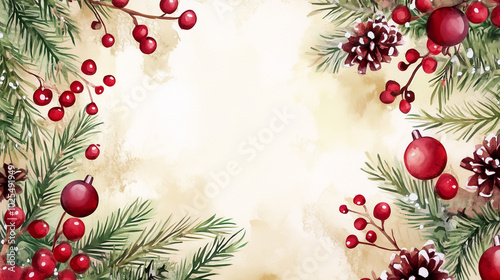 A beautiful watercolor illustration showcases a festive border adorned with lush pine branches, vibrant red berries, and detailed pine cones, ideal for seasonal greetings, copy space