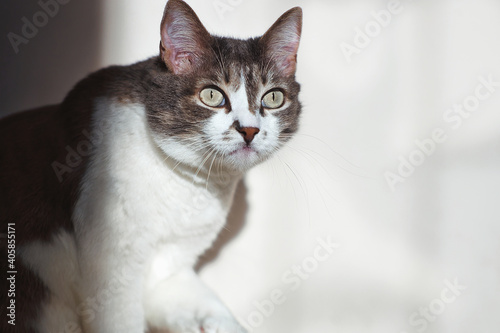 A beautiful well-groomed gray cat looks away with interest. A pet on a light background with space for the design of advertising products. Portrait of a calm noble cat.