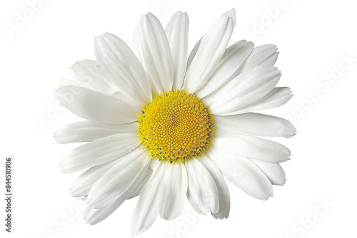 A beautiful white daisy flower with a yellow center, surrounded by petals, isolated on transparent background.