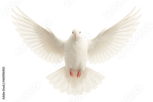 A beautiful white dove, a symbol of peace and freedom, with its wings spread wide open flying on a clear background, isolated on a transparent background