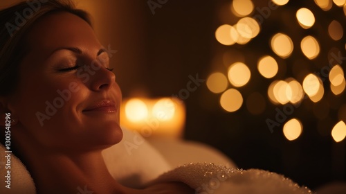 A beautiful woman enjoys a relaxing facial treatment with natural ingredients. Soft lighting enhances her peaceful expression, creating a calming atmosphere