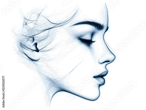 a beautiful woman's face, profile view, sketch drawing style, white background, hair flowing in the wind, soft light on her skin