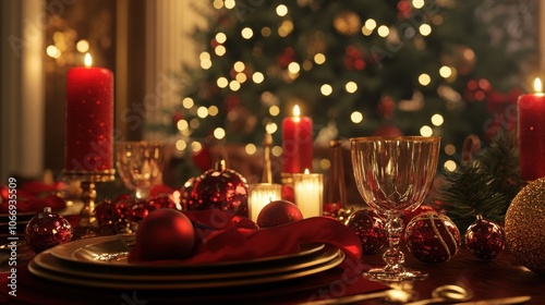 A beautifully arranged 3D Christmas table setting with red and gold decorations, sparkling baubles, and elegant candles, set in front of a twinkling Christmas tree