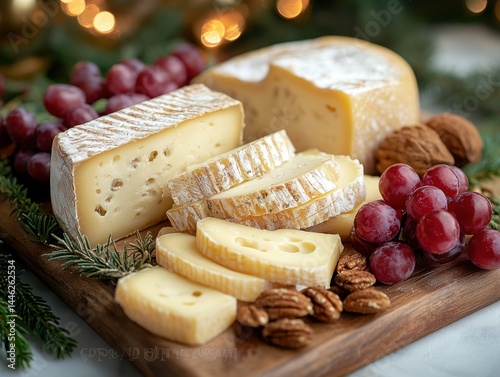 A beautifully arranged cheese platter with grapes, nuts, and festive greenery