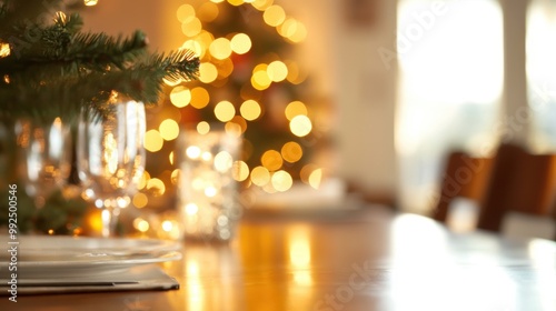 A beautifully arranged dining room showcases an elegant table set for a Christmas celebration, complete with sparkling decorations and warm lights