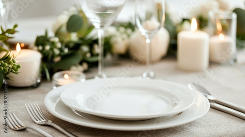 A beautifully arranged dining table with a linen tablecloth, plates, silverware, and a candle centerpiece, with copy space, high-resolution photo, realistic photo