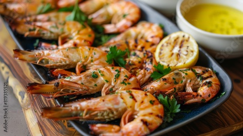 A beautifully arranged dish of grilled prawns, garnished with parsley and served with a zesty lemon dipping sauce.