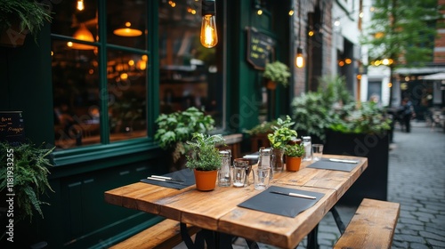 A beautifully arranged outdoor restaurant table set for dining, showcasing an inviting atmosphere with greenery, warm lighting, and a rustic wooden design that appeals to diners.
