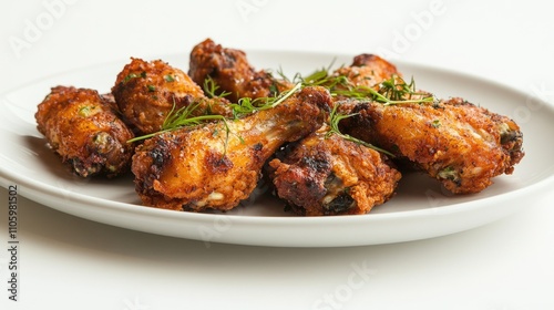 A beautifully arranged plate of crispy fried chicken pieces, glistening with golden-brown perfection, set against a clean white background, inviting viewers to indulge in this classic comfort food.