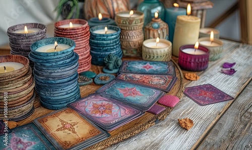A beautifully arranged tarot card layout adorns a wooden table, surrounded by softly glowing candles that create a tranquil atmosphere, perfect for meditation and personal insights