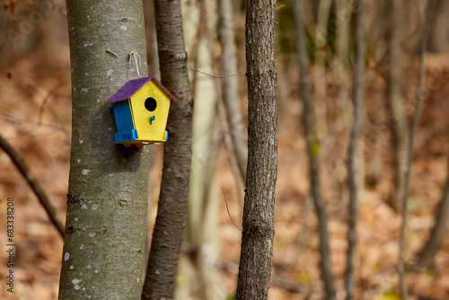 a beautifully colored birdhouse in the forest, hanging on a tree.