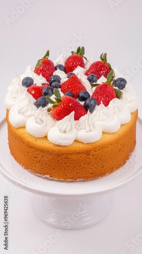 A beautifully crafted shortcake cake showcases a creamy topping adorned with an assortment of fresh berries and mint leaves, presented elegantly on a white stand
