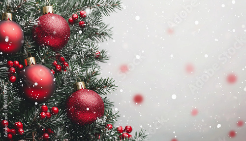 A beautifully decorated Christmas tree adorned with red ornaments and frosted branches in a snowy setting, creating a festive atmosphere