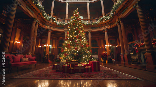 A beautifully decorated Christmas tree in the center of a grand hall, surrounded by wrapped presents and festive decorations. The room is filled with the sound of carolers singing and the smell of pin