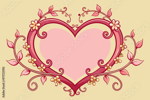 A beautifully decorated heart shape surrounded by floral vines and leaves, featuring soft pink tones and delicate flowers, perfect for romantic themes or design projects