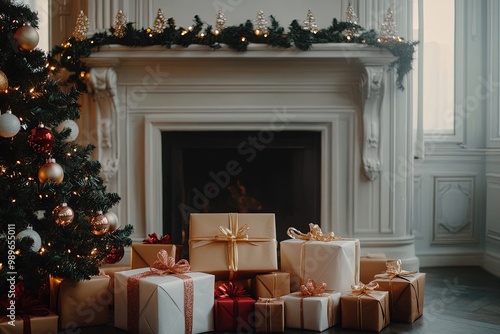 A Beautifully Decorated Living Room Featuring a Christmas Tree and Neatly Wrapped Gifts Near a Cozy Fireplace During the Holiday Season