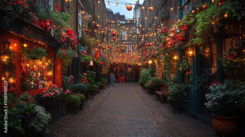 A beautifully decorated narrow alleyway illuminated by festive string lights and adorned with vibrant red and green Christmas decorations, evoking a cozy holiday atmosphere.