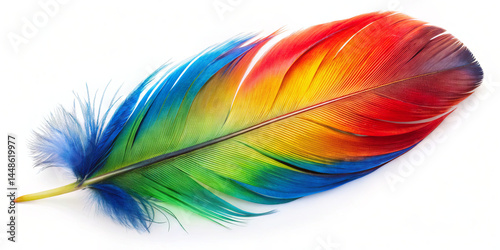 A beautifully detailed feather displays a stunning array of colors including red, blue, and green. The feather's intricate patterns and textures stand out vividly against the white backdrop