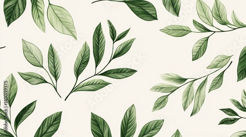 A beautifully illustrated pattern of various green leaves, showcasing different shapes and sizes against a white background.