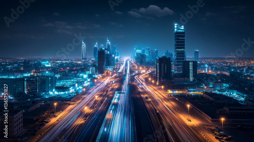 A beautifully long-exposure photograph capturing the illuminated KAFD district in Riyadh