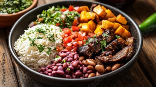 A beautifully plated traditional Dominican food, captured from the perspective of a famous food photographer.