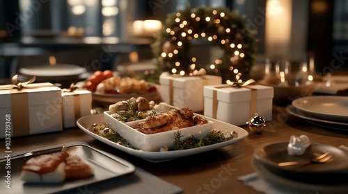 A beautifully set Christmas dinner table with food, gifts, and festive decorations.