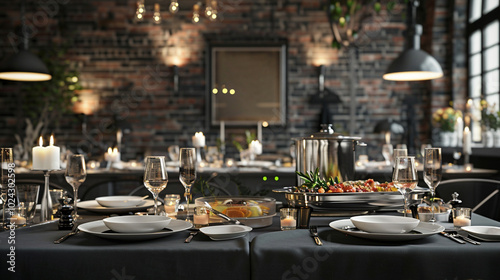 A beautifully set dinner table in a stylish restaurant, featuring candles, glassware, and gourmet dishes, creating a warm, inviting atmosphere.
