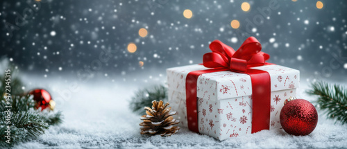 A beautifully wrapped Christmas gift sits in the snow, adorned with a red ribbon and surrounded by pine branches and red ornaments, creating a festive winter scene. : Generative AI