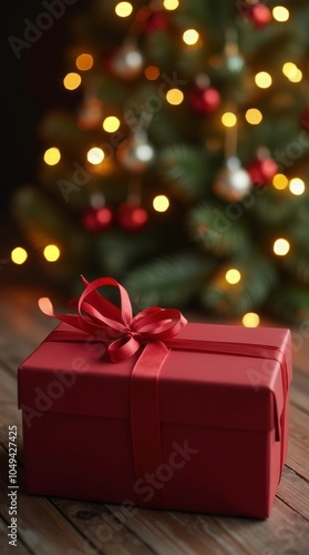 A Beautifully Wrapped Christmas Present With a Ribbon Sits Under the Twinkling Lights of a Festive Tree. Generative AI
