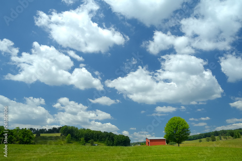 A beautoful spinrg day in a meadow with a nice red barn and a big blue sky with white fluffy clouds.