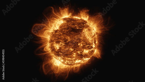 a big sun surface with solar flares and copy space on black background, global warming concept.