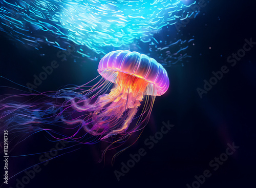 A bioluminescent jellyfish gracefully drifts in the deep ocean, its vibrant tentacles trailing behind. The water shimmers with an ethereal glow.