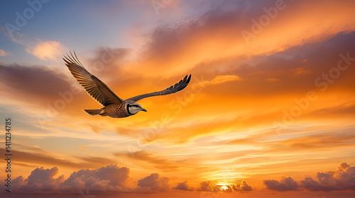 A bird soaring through the sky at sunset with warm hues and soft clouds