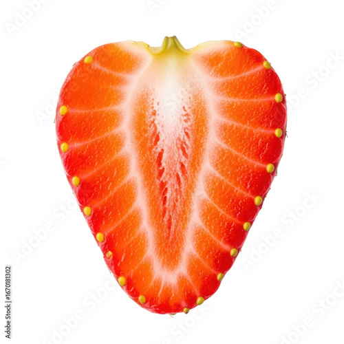 A bisected ripe strawberry with vibrant red flesh and yellow seeds, showcasing intricate internal structure on a transparent studio background, extreme macro. Concept of nature's hidden beauty