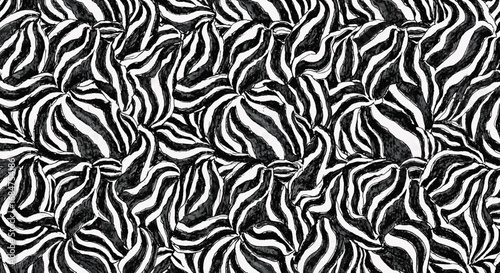 A black and white abstract pattern with swirling shapes resembling zebra stripes.