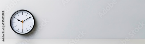 A black and white clock hanging on a white wall, showing the time with clear contrast