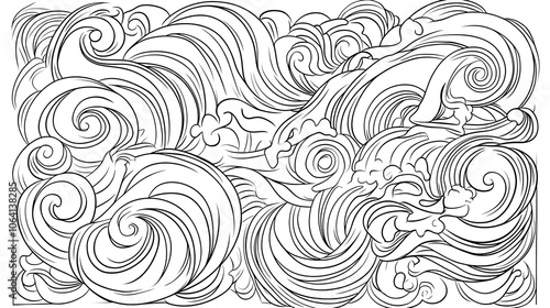 A black and white coloring page with complex, interconnected wave patterns in flowing swirls, bold outline, isolated on white background.