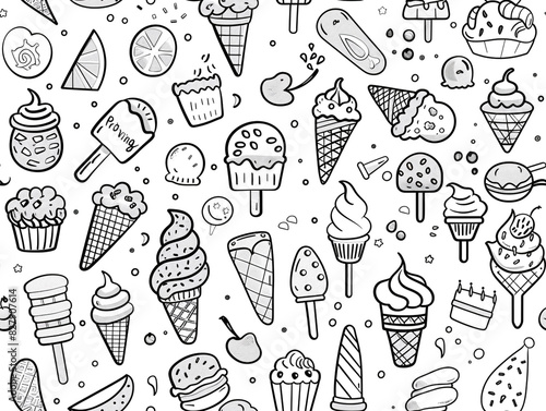 A black and white drawing of various ice cream flavors and toppings. The scene is playful and fun, with the various ice cream flavors and toppings creating a sense of whimsy and delight