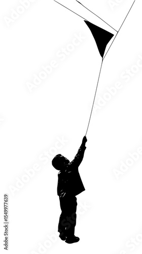 a black and white silhouette of a person holding the string of a kite black, boy, child, fly, hold, kite, man, person, silhouette, string , Generative art.